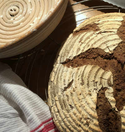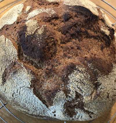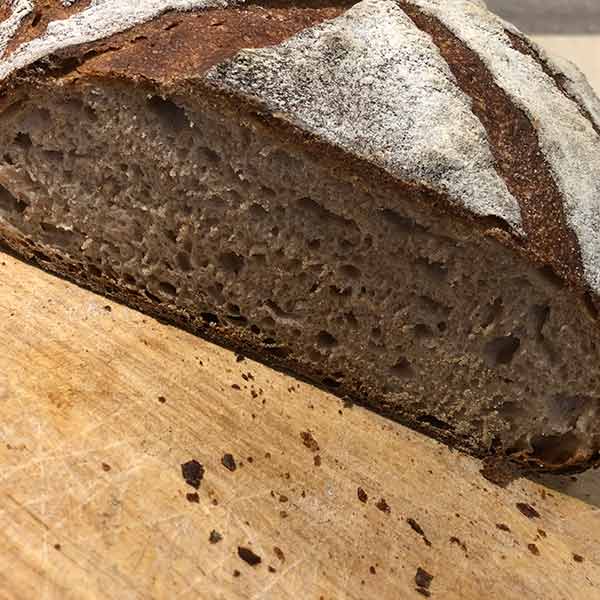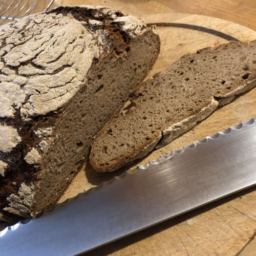 Alle Zutaten gut vermischen. Kneten wie bei Weizenteigen ist nicht erforderlich, da sich kein Kleber ausbilden kann. Die Masse ca. 30 min. ruhen lassen. Dann auf den dick bemehlten Tisch kippen. Die Oberfläche leicht bemehlen. Überschüssiges Mehl abfegen. Vom Rand her zu einer Kugel falten, ohne dass das Mehl von aussen eingearbeitet wird. Die Kugel in einen dick bemehlten Gärkorb mit Schluss nach unten legen. Nicht zudecken, die Oberfäche soll trocknen. Ungefähr 80 – 90 min. bei Raumtemperatur gehen lassen. Das Brot im Gärkorb etwas locker rütteln und dann mit einem Schwung auf Backpapier schubsen. Schluss nach unten. Bei 260º einschießen. Kein Schwaden. Die Temperatur auf 210º reduzieren und das Brot ca. 55 – 60 min. backen. Vor dem Anschneiden unbedingt ganz auskühlen lassen. Auch wenn es schwer fällt, am besten bis zum nächsten Tag warten.