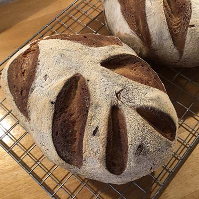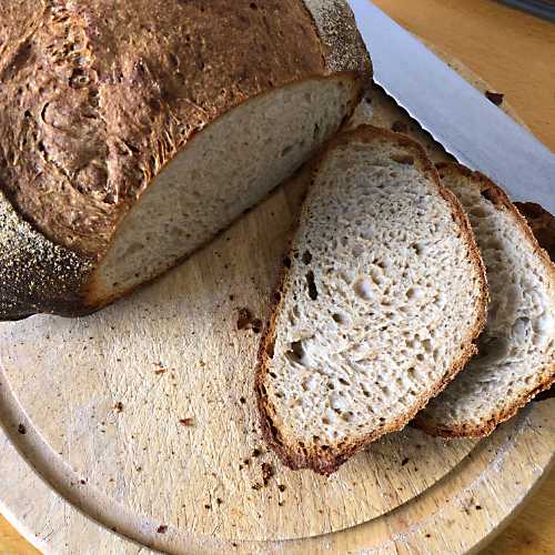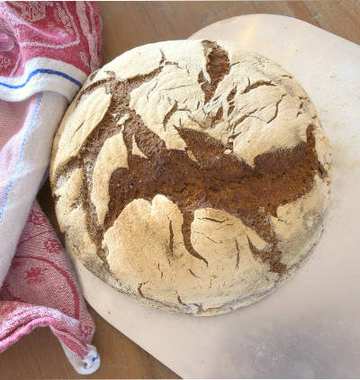 Den Ofen auf 260º vorheizen. Das Brot mit reichlich Schwaden einschießen. Auf 220º reduzieren und ca. 50 – 60 min. backen.