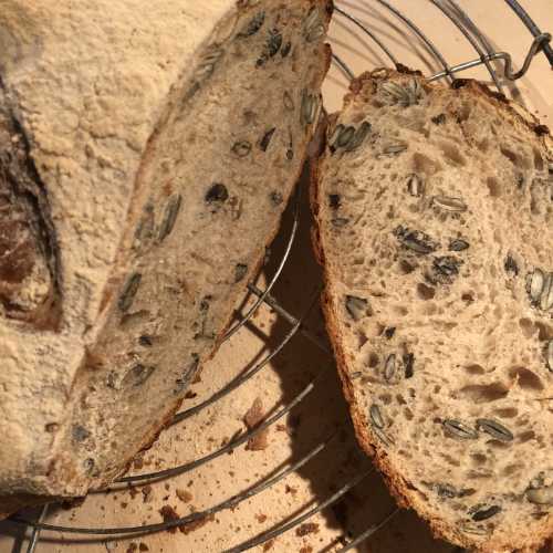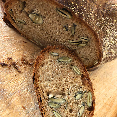 Die Zutaten außer den Kürbiskernen in der Teigmaschine zu einem Teig verarbeiten. Wenn der Teig elastisch ist, die Kürbiskerne unterkneten. In der dünn ausgeölten Teigwanne bei Raumtemperatur 2 Stunden gehen lassen. Zwischendurch einmal falten und stretchen. Dann 45 min gehen lassen. Falten und stretchen, weitere 30 min. gehen lassen. Zu einer Kugel falten und stretchen mit Griess bestreuen. Ca. 20 – 30 min. Stückgare mit Schluss nach oben und Gärfolie abgedeckt. In den auf 250º vorgeheizten Ofen mit Schluss nach oben einschießen. Reichlich beschwaden. Auf 220º reduzieren und 45 – 50 min backen.