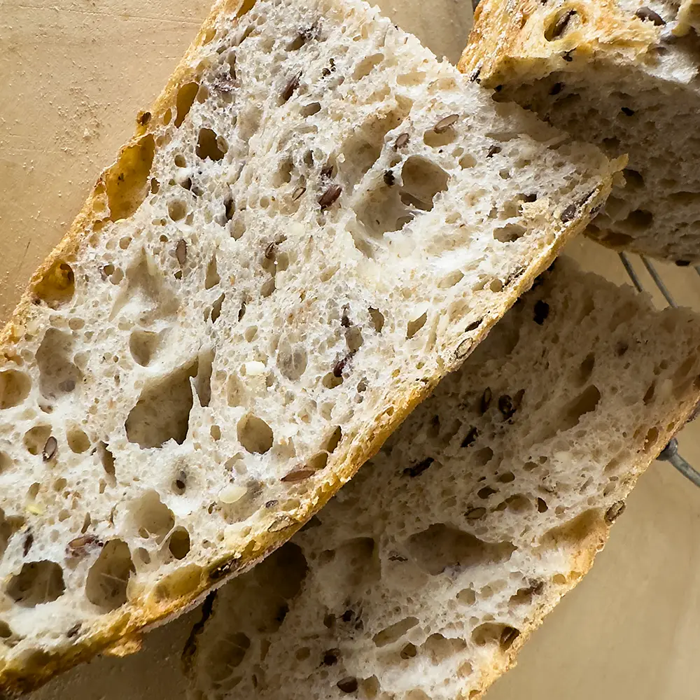 Den Teig in der Gehwanne aus dem Kühlschrank holen und ca. 1 Stunde aklimatisieren lassen. In drei gleiche Stücke teilen und vorformen und 15 min. unabgedeckt ruhen lassen. Zu Baguettes formen und 30 – 40 min. im Leinentuch gehen lassen.