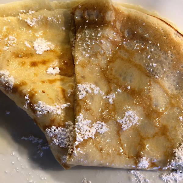 Zu Vierteln falten und mit Puderzucker bestäuben. Nach Wunsch noch etwas Alkohol darüber gießen. Ggf. flambieren.