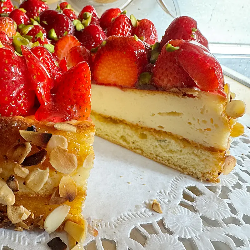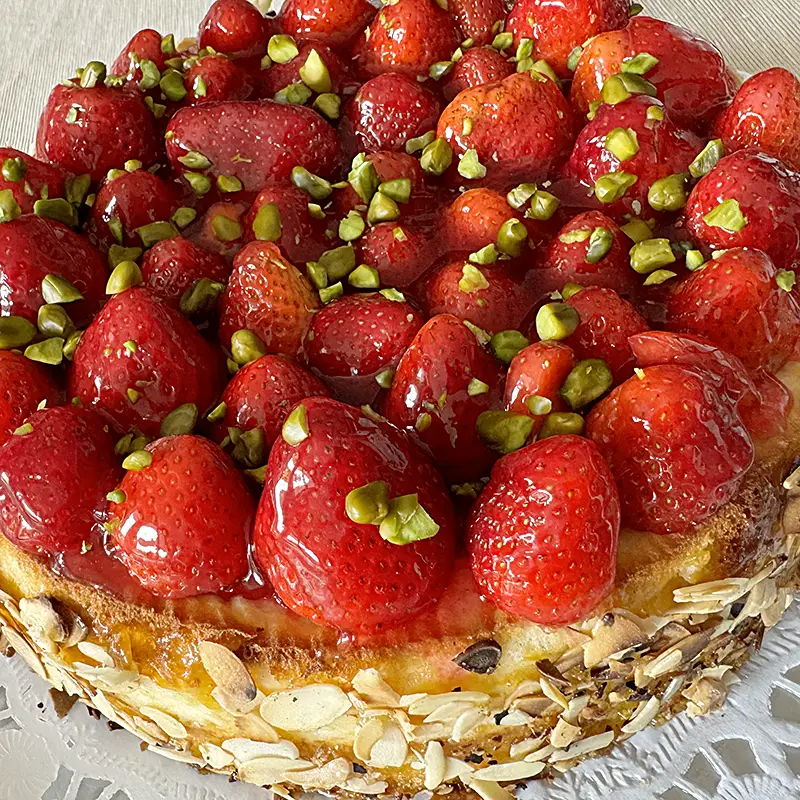 Den Rang ebenfalls mit Aprikosenmarmelade einstreichen und mit gerösteten Mandelplättchen verzieren. Zum Schluss über die Erdbeeren gehackte Pistazien streuen.