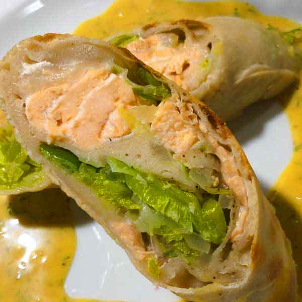 Das Lauch in ganz wenig Olivenöl etwas anschwitzen. In der Pfanne abkühlen lassen, den gewürfelten Lachs hinzugeben und am besten mit den Händen vermischen. Alles gleichmäßig auf dem Strudelteig verteilen. Bei 230º 15 min. auf Backpapier backen
